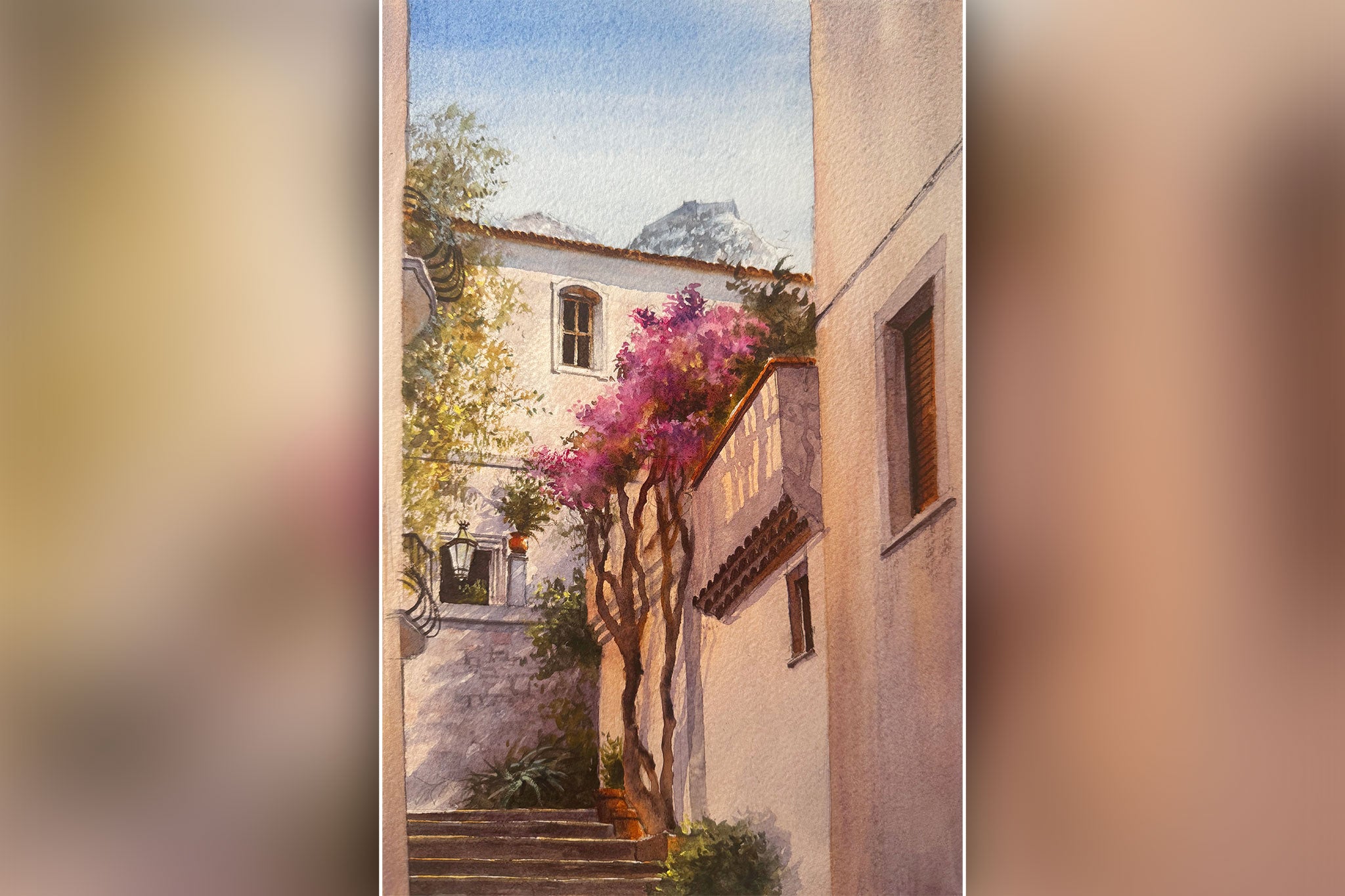 Today’s watercolour landscape tutorial is inspired by a photo I took a few years ago, when visiting a picturesque little village called Taormina in Sicily.